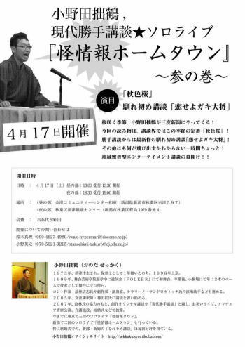 怪情報ホームタウン 〜参の巻〜 時は平成22年4月17日土曜日。 場所は新潟県新潟市秋葉区。 桜が咲き始めた初春、晴天、小野田の故郷で三回目のソロライブ。 昼は金津コミュニティーセンター、夜は新津健康センターと二箇所を渡り歩いた大行脚ならぬ、ちい行脚。 “地域密着型エンターテイメント講談”を掲げた今回の模様をお届けしよう。 |