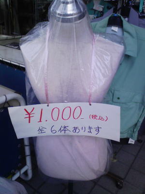 8/24(火) 夕方、近所の自動販売機を何気なくみると。 相当の数、ポカリあります。 が、 これ、ぜ〜〜〜〜んぶ、 「売り切れ」マークついてます!! この自販機だけで何本売れたんでしょうか?! 今年の猛暑を表す一枚。 8/23(月) 井の頭線新代田駅近くのワークショップにて。 こんなものまで売っているんですね。 顔つきの方が安い! あまりイケメンではない、微妙な顔立ちだからか? ちょっと肌が茶色いからか? ワンコインマネキンいかがですか?